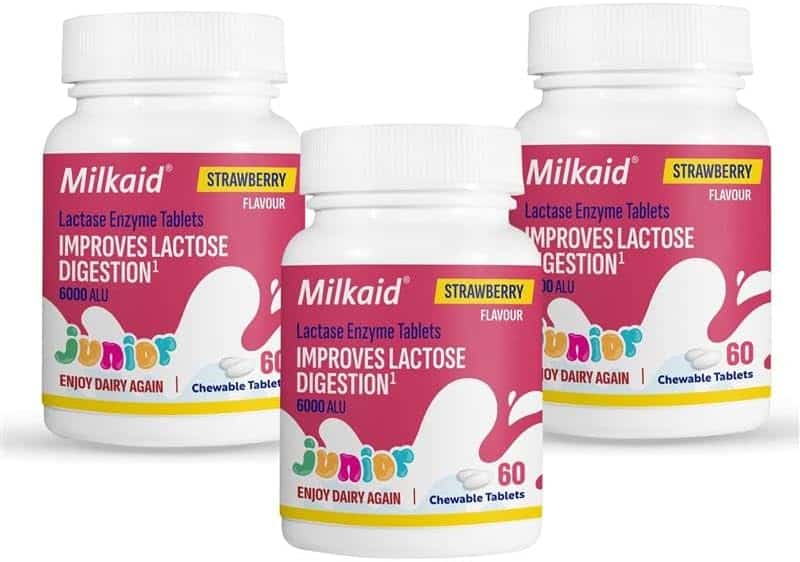 Milkaid Junior Tablets contain lactase enzyme to help break down the lactose present in milk and dairy foods, allowing both children and teenagers to eat their favourite dairy foods. This Lactase Enzyme Supplement comes in a tasty strawberry flavour and is suitable for vegetarians as well as being gluten free.